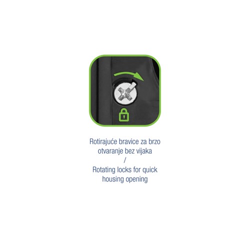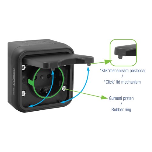 250V IP55, antracitCommel nadžbukne instalacijske sklopke i utičnice ističu se vrhunskom kvalitetom izrade i modernim dizajnom u atraktivnoj antracit boji. Zahvaljujući IP55 stupnju zaštite pogodne su za ugradnju u vrlo vlažne prostore ili na otvorenom. Inovativni sistem bez vijaka omogućava iznimno brzu montažu i sigurno zatvaranje kućišta proizvoda. Gumirane uvodnice za kabel nalaze se s gornje, donje i stražnje strane kućišta.