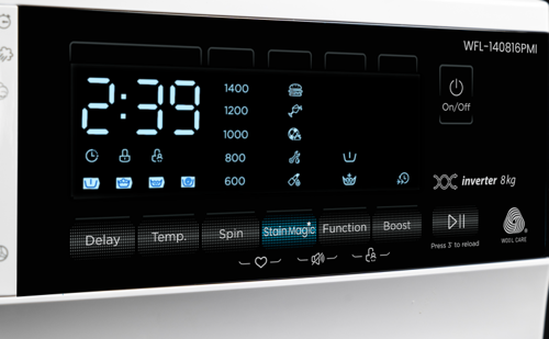 Program pranja “Steam Hygiene” pruža sterilizaciju pamučne odječe pomoću vruće pare te odječu čini svježom i sterilno čistom. Kontrolna ploča perilice rublja WFL-140816PMI s centralno smještenim okretnim gumbom za odabir programa pomažu da se u svega tri jednostavna koraka pokrene proces pranja.Sve specifikacije